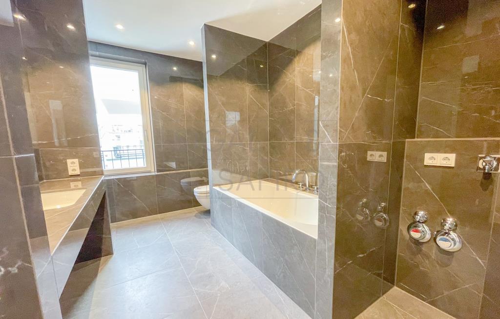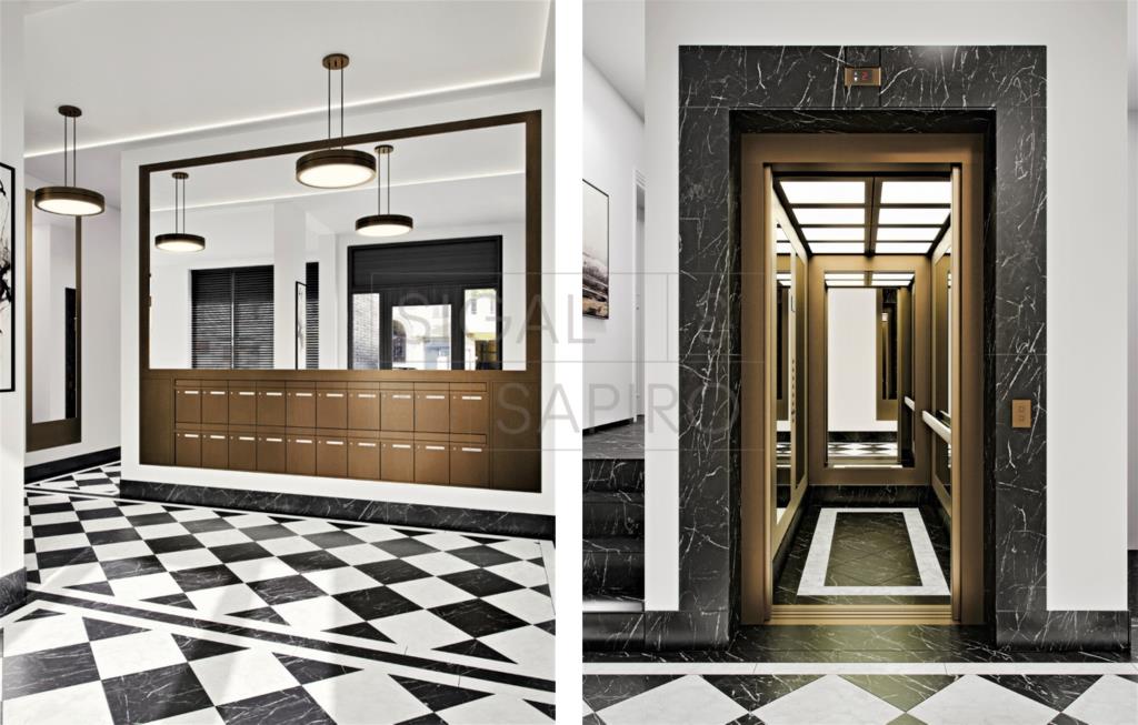 Ein besonderes Augenmerk wird auf das Entree des Hauses gelegt. Der repräsentative Eingangsbereich soll in seiner Konzeption den anspruchsvollen Charakter des Gebäudes wiederspiegeln und die Bedeutung der neuen Adresse im städtischen Kontext unterstreichen. In der 30 m² großen Lobby kommen ausgesuchte Materialien wie Naturstein, patiniertes Messing und großformatige Spiegel zum Einsatz und strahlen Eleganz aus. Auf der Rückseite des Hauses befindet sich der schön angelegte Hofgarten, dessen Gestaltung den Ansprüchen der Architektur gerecht wird. Im Untergeschoss befinden sich neben den Privatparkplätzen auch die Kellerräume jeder Wohnung; sie zählen zu den zahlreichen Annehmlichkeiten, die den Bewohnern auf höchstem Niveau geboten werden.