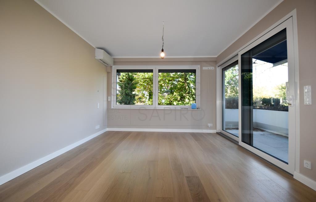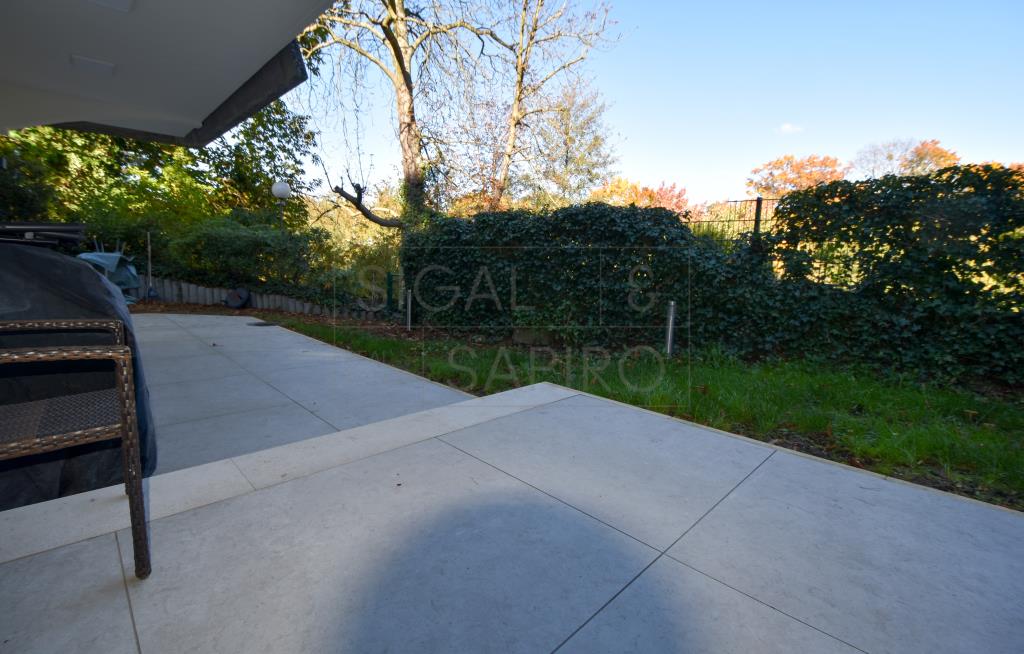 Die Balkon- und Gartenflächen sind harmonisch miteinander verbunden. Der neu gestaltete Garten mit großformatigen Feinsteinplatten, stilvoll integrierter Treppe und wettergesteuerten Markisen erweitert den Wohnraum ins Freie – ein exklusiver Rückzugsort mitten im grünen Grunewald.