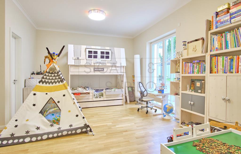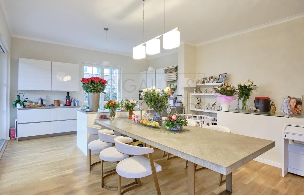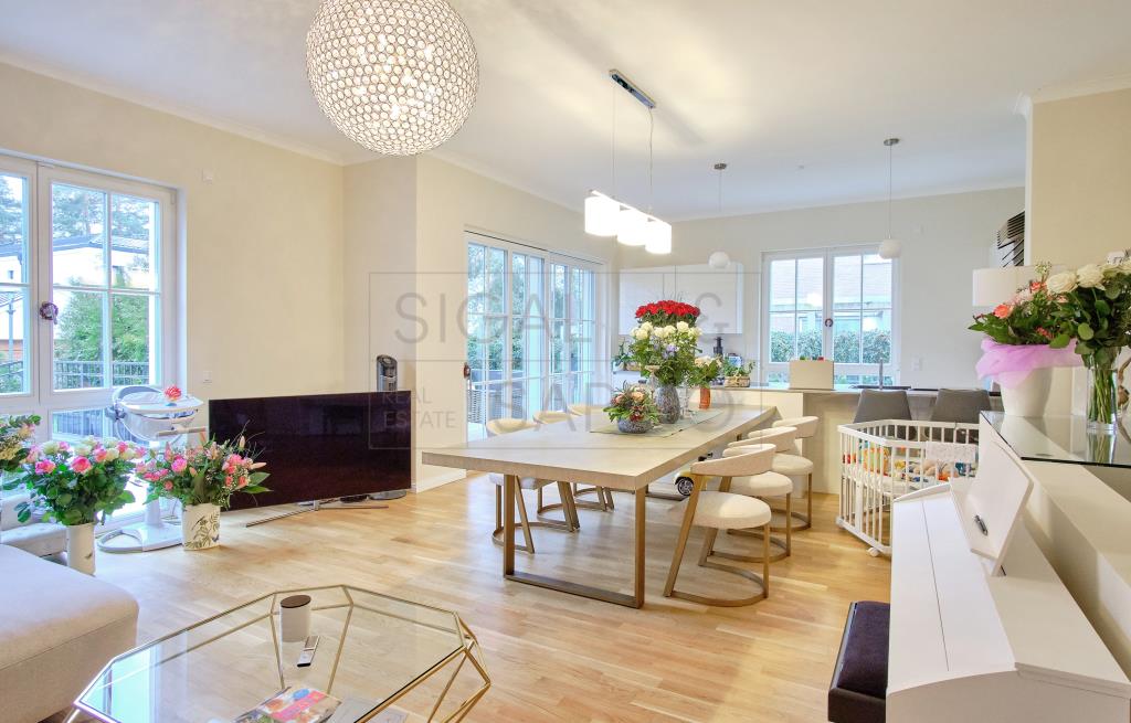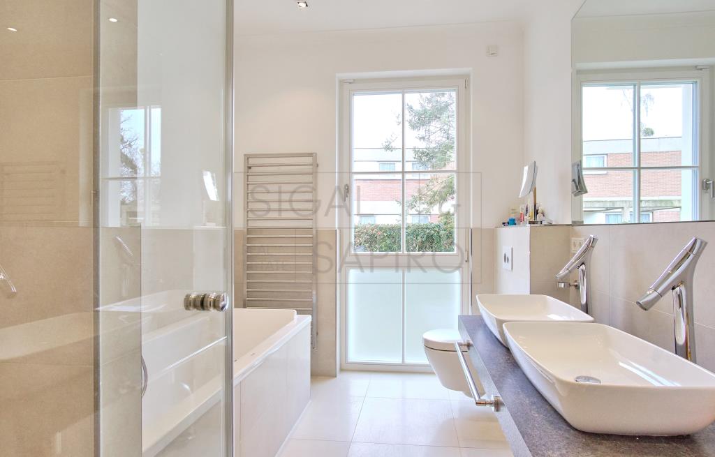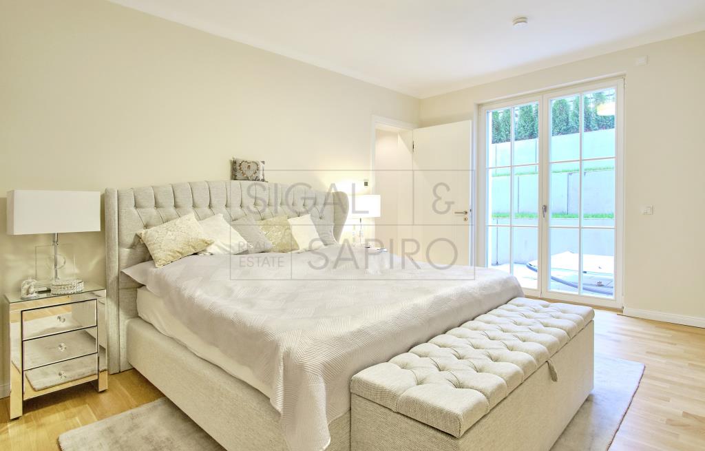 Die angebotene Wohnung befindet sich im Erdgeschoss einer luxuriösen Stadtvilla aus dem Jahr 2018. Es handelt sich um eine 6-Zimmer-Wohnung mit ca. 379 m² Garten als Sondernutzung sowie Wohnnutzfläche im tagesbelichteten Untergeschoss. Die Wohnung verfügt im Erdgeschoss über ein Wohn- und Esszimmer mit offener Küche und Zugang zu einer ca. 36 m² großen Terrasse und zum Garten in Südausrichtung, zwei Schlafzimmer, ein Badezimmer sowie einen Hauswirtschaftsraum. Im Souterrain befinden sich zwei Schlafzimmer mit en Suite Bädern, eine Ankleide sowie ein Studio.