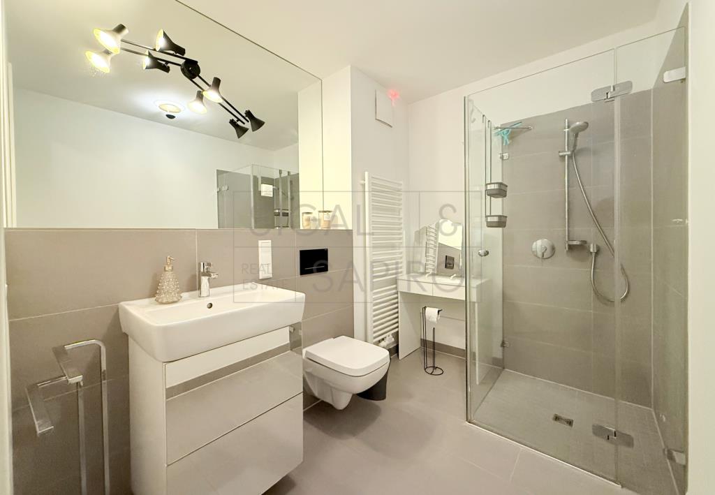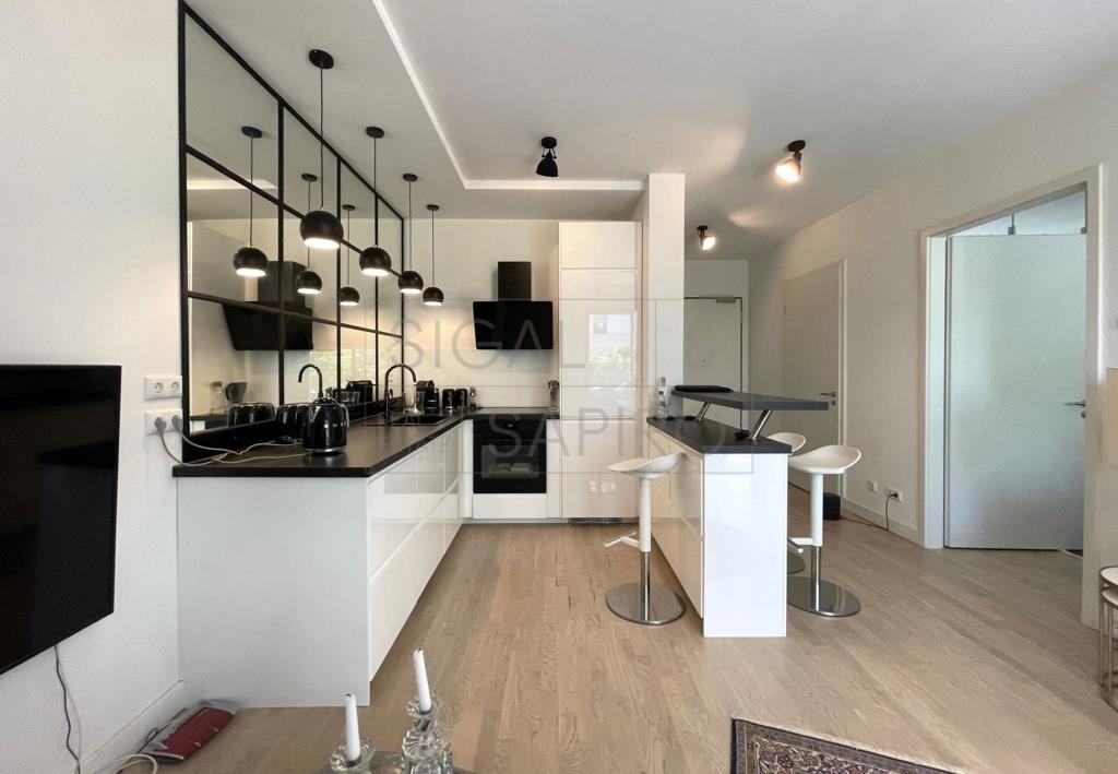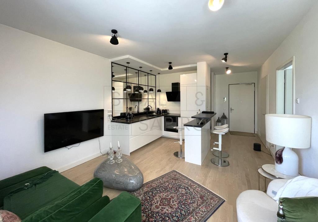 Diese stilvoll und modern möblierte 2-Zimmer-Wohnung überzeugt durch eine hochwertige Ausstattung und eine durchdachte Raumaufteilung. Bodentiefe Fenster sorgen für viel Tageslicht und schaffen eine helle, freundliche Wohnatmosphäre. Die offene Küche mit elegantem Bartresen fügt sich harmonisch in den Wohnbereich ein und lädt zum Kochen und Verweilen ein.